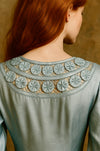 Discover the unique elegance of this original 30s silk pale blue dress. Crafted from luxurious duck egg blue 1930s silk, this dress features a bias cut and stunning ribbon geometric design on the neck line and sleeves. With long sleeves and side buttons, it's a one-of-a-kind dress timeless piece.