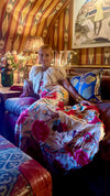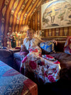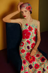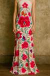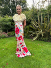 Discover a truly timeless and exquisite piece with this reworked 40s floral canton shawl dress. Made from a magnificent Museum worthy silk and featuring oversized embroidered pink flowers, this dress boasts a bias cut and mermaid silhouette for a flattering and elegant fit. With a back zip and macramé shoulder detail,