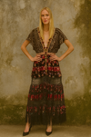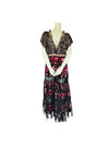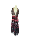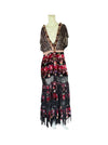 This one-of-a-kind dress masterfully blends 1920s and 1940s influences, featuring a reworked velvet bodice with short sleeves and a deep V-neckline, adorned with intricate antique metallic tassel embroidery. The panelled skirt showcases a 1940s print enhanced by cascading fringe macramé panels, creating elegant movement. Finished with a front V neckline and button fastening at the back, this dress offers a unique combination of vintage craftsmanship and sophisticated detailing for a timeless statement piece.