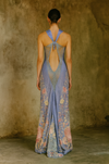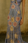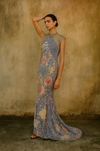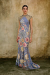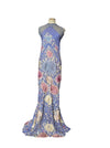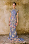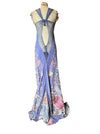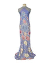 This reworked 1940s Mina gown showcases exquisite floral embroidery in delicate pastel hues that beautifully complement the duck egg and light purple silk fabric. Featuring a unique macramé shoulder design, the dress is expertly cut on the bias, with elegant side and back godets that form a graceful mermaid train. Has a knotted racer back design and a discreet back zip and bias-cut silhouette enhance the fit, making this long piano shawl dress a sophisticated statement piece rich in historical craftsmanship meets modern woman.