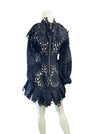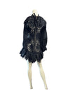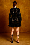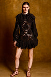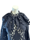 Experience timeless elegance in this one off vintage eyelet frill dress. This bespoke reworked piece is crafted from black cotton eyelet fabric, showcasing long balloon sleeves, a charming frill neckline, and a fitted silhouette with a matching frill hem. With a gold zip at the back, this dress is perfect for cocktail attire with boots or flat shoes.