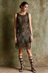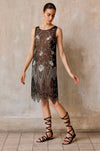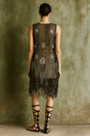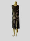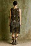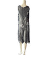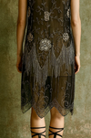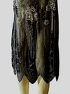 Stunning original 1920s black silk beaded flapper dress. Featuring a sleeveless V-neck design, scalloped hem, and cascading silver fringes , this dress exudes timeless elegance. The intricate silver and white beaded flowers add a touch of glamour, making it the perfect cocktail dress for any occasion. In excellent condition and an investment piece.