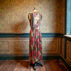 The Ophelia dress combines a unique, one-off vintage silk sequins skirt in earthy tones with a patchwork Victorian antique waistcoat, designed for a distinctive look. Its sleeveless design and front tie facilitate ease of wear while ensuring a comfortable fit. Had front snap buttons, this UK size 10 dress offers an elegant yet relaxed silhouette.