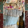 This one-of-a-kind Victorian jacket features intricate lace details and a stunning 1920s beaded sequin design around the front and back. Crafted from a duck egg blue silk, it boasts long curved sleeves with delicate lace cuffs and original boning for a touch of authentic luxury. With a fringed bodice and hem, this jacket exudes versatile sophistication. Has front buttons but best kept open.