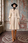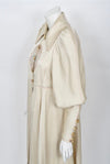 Rare and collectible Bill Gibb of London, Couture ivory satin coat from the Late 60s early 70s. Bill Gibb was one of the most famous designers in the 1970s in Britain and this look is a wonderful example of his ethereal Aesthetic. The front centre has beautiful style floral embroidery in shades of pink and baby blue. The collar is cut wide and has front buttons. The hero detail is the dramatic mutton sleeve finished with matching buttons and a wide cuff. The front has two hidden front pockets. A real investment piece.