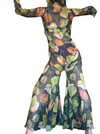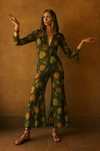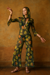 Our reworked 30s floral jumpsuit features flared long sleeves and a keyhole design on the front with a necktie, this jumpsuit is made from silky floral print fabric in bottle green, vibrant orange, and yellow. With its long flared silhouette and wonderful movement. A true one-off.