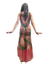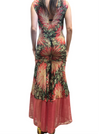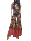 Experience vintage gold dust with our sumptuous  reworked 1930s floral chiffon dress turned jumpsuit. This one-of-a-kind piece features a front V neck line and sleeveless design, with flared trousers and a contrast coral pink hem. Fastens at the back with a necktie.