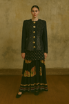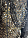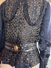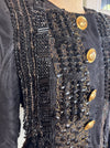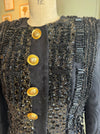 This expertly reworked 1980s silk brocade jacket features a fitted design with long sleeves and a distinctive neckline. Statement gold buttons enhance the front, while blackjet beading and sequinned pleats intricately adorn the body. The back reveals a rare pleated design subtly integrated within the sequins, making this piece truly unique and irreplaceable. Perfect for collectors or those seeking sophisticated vintage elegance with a modern appeal.