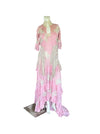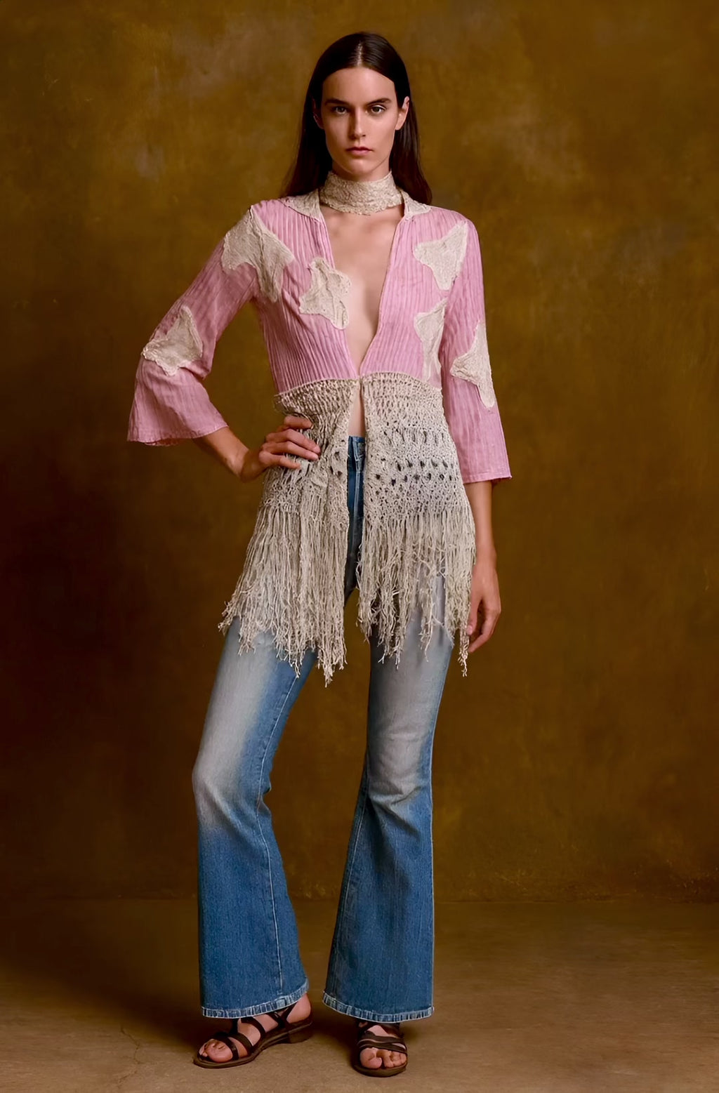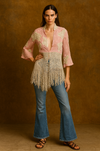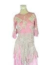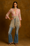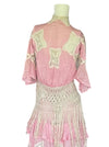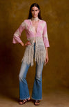 The Monique jacket is a one-of-a-kind Victorian piece that combines delicate pink cotton and cream lace inserts for an elegant pretty look. The three-quarter length sleeves and macramé fringe add a touch of 1940s design. Pair with the matching dress or dress it down with denim for a versatile and pretty addition to any wardrobe.