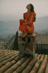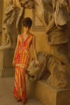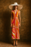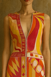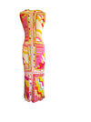 Introducing an iconic and documented Pucci dress, 70s silk jersey, featuring a bright, vibrant orange, pink, white, and yellow print. With a sleeveless design and adjustable front zip, this straight-fit dress offers a revealing and flattering silhouette. A rare and collectable timeless piece.