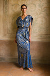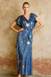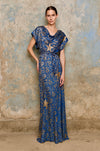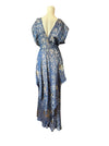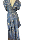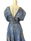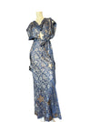 Exude timeless elegance with this stunning 30s blue and silver bias cut dress. Featuring a front cow neckline and a back V-neck design, short wide sleeves, and an asymmetric outer skirt hugging the back, this 1930s original is a true one of a kind with added silver stars scattered throughout. Complete the look with the matching belt. Has side hook fastening.