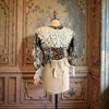 Crafted from a cream raw silk and black lace with a hand painted floral design on the back. Finished with a French lace hem. It boasts long curved sleeves with handmade cream lace cuffs. Has its original boning for a touch of authentic luxury and is in excellent condition. This jacket exudes versatile sophistication and represents authentic craftsmanship. Has front hooks but best kept open.