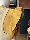This wonderful 70s suede patchwork short sleeve jacket features a unique cropped design with a blend of cream and butter yellow suede. Its decorative floral patchwork and leather button closure makes it a perfect layering piece. Has wide shoulder caped sleeves and a true classic. This jacket serves as a versatile layering piece, suitable for various casual outfits.
