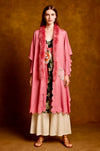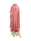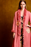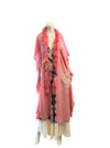 This incredible vibrant silk robe embodies the elegance of the 1930s with its coral colour and embroidered back design. The cream lace inserts and feather trim add a delicate feminine touch, while the concealed button is adorned with a blush handmade velour flower. Perfect as a standalone piece or cover up paired with denim or a simple dress.