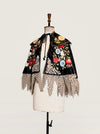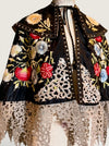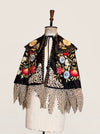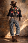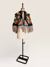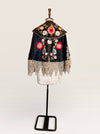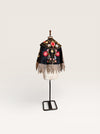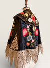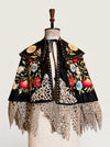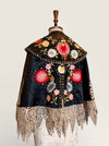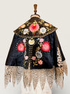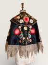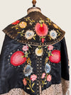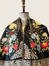 Introducing a magnificent embodiment of 1930s matador Trajes de Luces elegance, crafted from sumptuous black silk. This singular cape, adorned with vibrant embroidered florals and silver sequins along its opulent collar, features an adjustable braided neckline and a unique scalloped suede hemline. A true future heirloom, it exudes a timeless artistry that transforms any ensemble into a statement of sophistication.