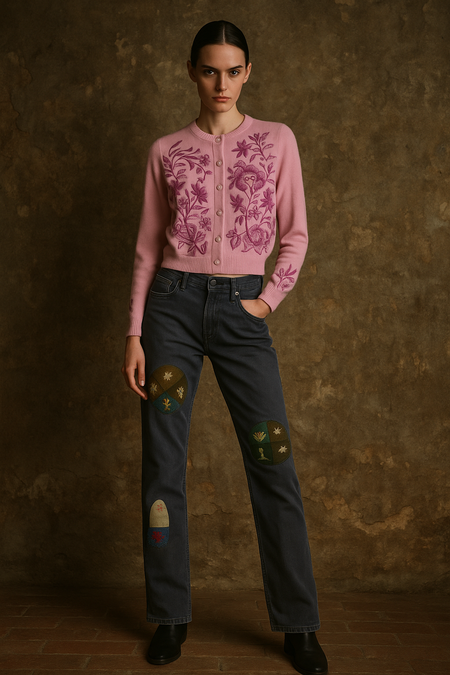 OV Denim, 70s jeans with Victorian hand embroidered patches