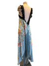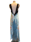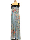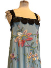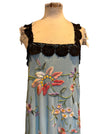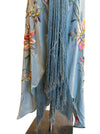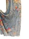 This wonderful reworked 40s embroidered silk and lace piano shawl dress is a unique piece crafted from an original fringed shawl. Featuring a pale blue embroidered design and lace black straps, it offers a straight cut silhouette that enhances comfort and versatility. Its timeless quality and heritage ensures it remains a classic addition to any wardrobe.