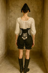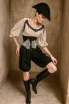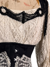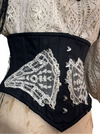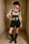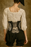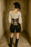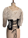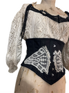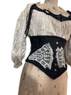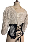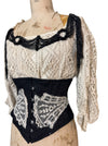 A unique reworking of a Victorian classic corset turned into a modern classic. This off white lace top showcases a square neckline and half sleeves, with an original 1920s black jet glass beaded fringed motif adding elegance and historical flair. The adjustable Victorian corset features its original boning making this top truly one of a kind.