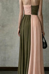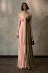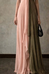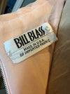 Exquisite 80s silk chiffon draped dress by Bill Blass. A rare gem of haute couture, it boasts a sophisticated interplay of muddy kaki and soft peach, harmonized through masterful draping along the empire line aqnd layers of chiffon. The elegant bustier silhouette, adorned with a knotted illusion beneath the bust, and discreet back zip add an air of refined allure, making it an impeccable choice for the discerning connoisseur of occasion wear.