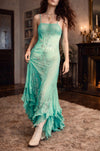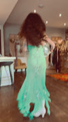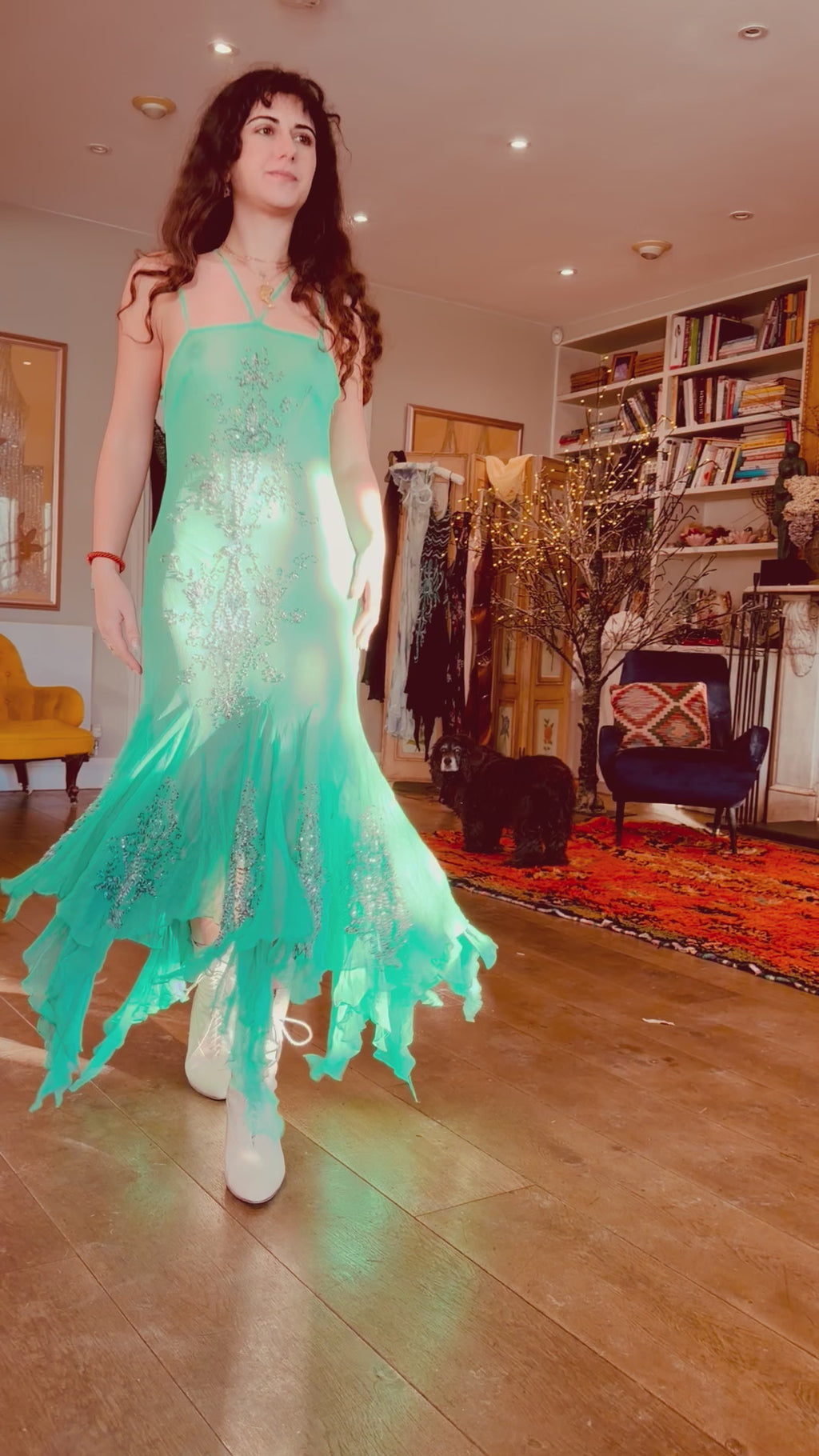 This vintage sample one-off bias cut dress combines the glamour of the 30s with the edginess of the 90s. Crafted from exquisite emerald green silk chiffon, it features intricate beading and a handkerchief fishtail silhouette that hugs and flatters the body. With thin straps and a side zip, it offers a perfect fit for any occasion. No label.