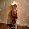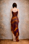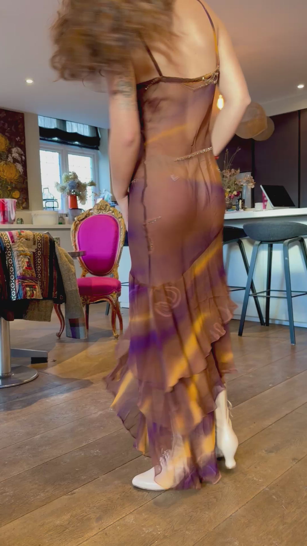Indulge in timeless elegance with this 90s silk chiffon beaded dress in earthy yet vibrant tones. The thin shoulder straps and asymmetrical cascading frills add sophistication, while the intricate rhinestone beading adds a touch of sparkle. Hand-finished for a perfect fit, with a side zip for convenience. This makes the perfect party dress,
