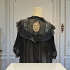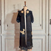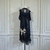 A truly stunning 30s black chiffon and lace robe/ peignoir. Short puff sleeves, lace cuffs, and front cream buttons add a touch of vintage glamour, while the black and hand made cream lace bust and skirt trim elevate the look even further.
