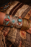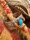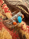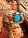 This antique Native American sterling silver turquoise and coral cuff showcases a beautiful etched design, adding a touch of native craftsmanship and elegance to any outfit. The adjustable open fit makes it comfortable and easy to wear. Crafted with expert precision, this timeless and versatile cuff uplifts even a simple t shirt.