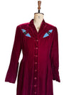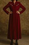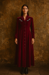 A rare and collectible Michéle Pernetta 80s burgundy velour cat eye long coat. With a tailored silhouette and a slight swing, this coat boasts long sleeves, lapels, and central front buttons. Donning a distinctive cat eye design on each shoulder with a blue iridescent button, this coat is a true gem made from silk velvet and fully lined.