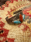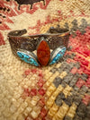 This antique Native American sterling silver turquoise and coral cuff showcases a beautiful filigree design, adding a touch of elegance to any outfit. The adjustable open fit makes it comfortable and easy to wear. Crafted with expert precision, this timeless and versatile cuff uplifts even a simple t shirt.
