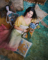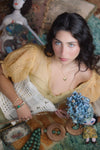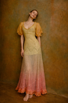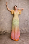 An exquisite embodiment of 1930s elegance. Crafted from luxurious eyelet organza, its vibrant considered ombré hues seamlessly blend into the ethereal floral eyelet print, while a front V-neck and puffed short sleeves accentuate the silhouette with captivating sophistication. The thoughtful side buttons and finely hemmed details whisper of meticulous craftsmanship making this piece a true one of a kind.