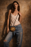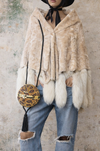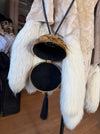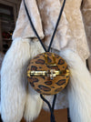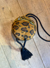 Introducing a splendid homage to the opulence of the 1970s, this circular bag, adorned in a striking leopard print, captures the essence of bold design. Its articulated half fastening opens to reveal an internal mirror, embodying utility in elegance. The long cord strap and gracefully arching tassel evoke a sense of timeless craftmanship.