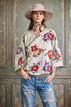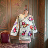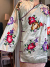 Original 1940s Chinese jacket featuring a mint green fabric with vibrant floral embroideries. Its A-line fit and long sleeves provide a flattering silhouette, while the raised collar and side button details enhance its vintage charm. Ideal for pairing with denim, this jacket adds a touch of elegance to casual outfits and looks fab with denim or simply over a dress.