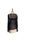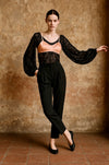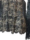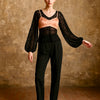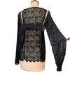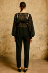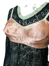 Tara, reworked 1930s black silk lace scalloped balloon sleeve blouse with 40s pink silk bra