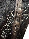 This exceptional original antique blouse showcases a refined rework of a 1930s black silk lace top featuring scalloped hem and elegant balloon sleeves finished with an elasticated cuff. It fastens at the back with a satin bow over a straight silhouette, complemented by a V-neckline. This piece includes charming metallic buttons and elasticated cuffs for added comfort. Attached is a 1940s-inspired pink silk bra with padded, shaped cups that enhance the fit and provide subtle play merging vintage aesthetics with expert tailoring.