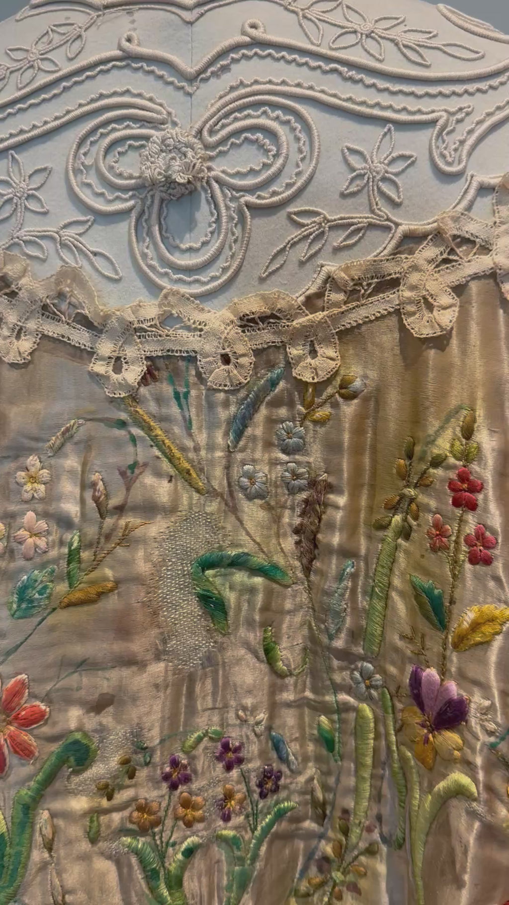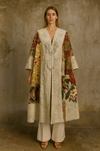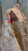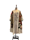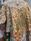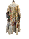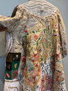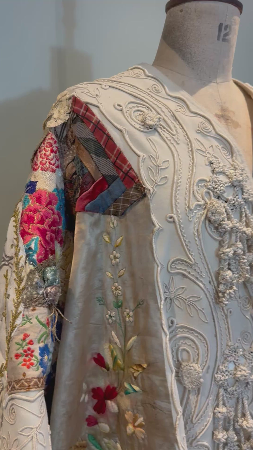Indulge in this one-of-a-kind reworked Museum-worthy Victorian patchwork coat. Crafted from a blend of Edwardian cream wool and intricate lace and a medley of rare embroidered floral appliqués spanning centuries. This coat features a curved structured sleeve and a swing design for an effortless chic silhouette. The intricate lace floral lace design and original cord buttons add an elegant touch to this luxurious piece. Perfect for special occasions or adding a touch of sophistication to your everyday look.