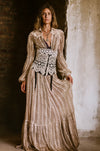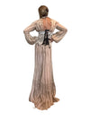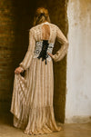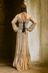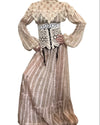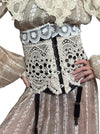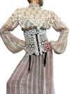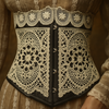 This reworked 40s black satin corset showcases a contrasting antique  cream lace motif framing the structure of the corset with its original suspenders. Designed with an adjustable black laced tie, it comfortably stretches to fit a 32-inch waist. Fastens at the front wit original ball hooks. Combining historical authenticity with versatile wearability, this unique piece offers both style and function for those seeking distinctive vintage elegance.