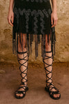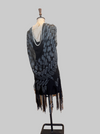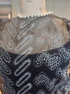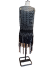Rare 70s navy and white print silk slip dress and tunic set from Iconic British designer Zandra Rhodes. The slip boasts a front V neckline and a beautiful ribbon beaded hem, while the outer tunic features a stunning loose back cowl neckline and faux pearl trim with a matching asymmetric ribbon design.