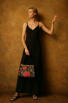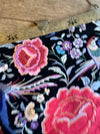 This rare and collectible unusually large handbag from the 1940s features a beautifully embroidered floral design on black silk accentuated with a brass etched cage clasp. Its elegant rectangular shape and sturdy construction make it the perfect accessory for any evening outfit. in excellent condition.